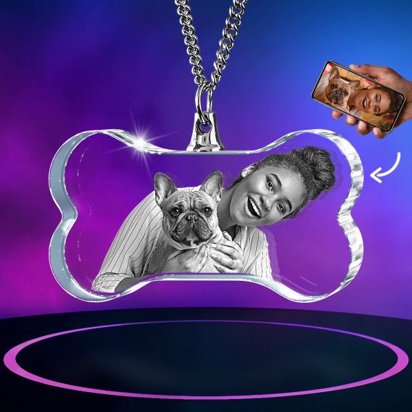 s there a photo of your adorable dog close to your heart? The 3D Personalized Dog Bone Necklace lets you keep it even closer! Made with top-quality K9 crystal, carefully engraved with the latest in subsurface laser technology, and all tied together on a 20" stainless steel chain, this cute keepsake for dog lovers is a sleek and stylish way to show off your fur-friend.